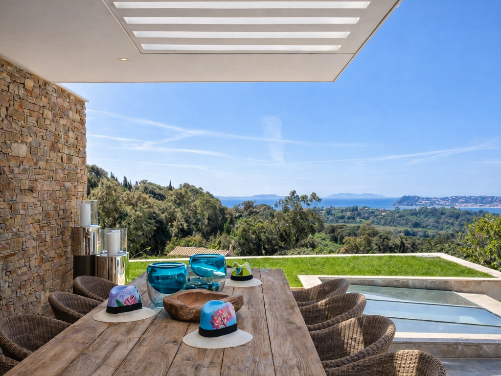 Villa Bleu Infini es una luminosa propiedad situada en una colina con vistas al Mediterráneo y al encantador entorno de Ramatuelle. Su diseño moderno, sus espacios abiertos y su piscina orientada al paisaje ofrecen un ambiente refinado y tranquilo, ideal para quienes buscan desconexión y confort junto al mar.