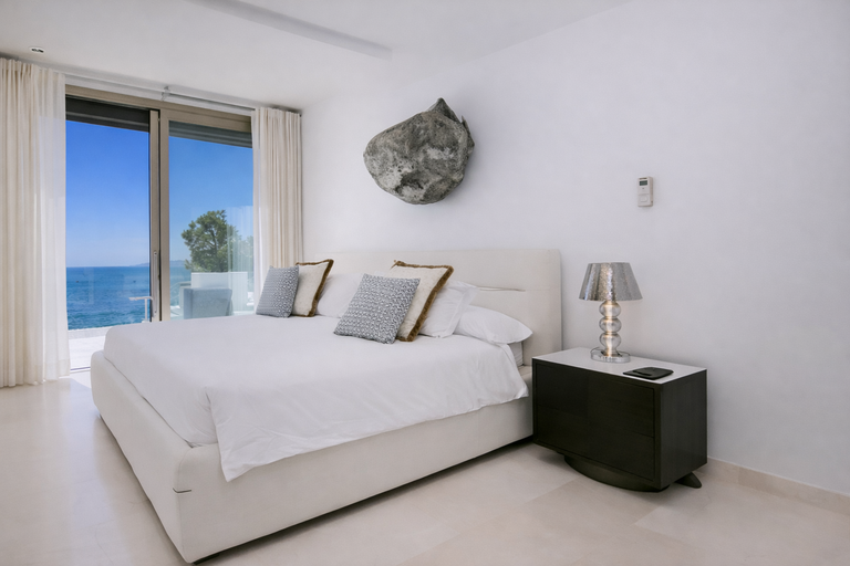 En el interior, los espacios destacan por su amplitud y diseño minimalista. La cocina está totalmente equipada y conectada al salón principal. Los dormitorios cuentan con baños en suite y vistas abiertas, lo que refuerza la sensación de hotel privado de alto nivel. Todo está pensado para ofrecer una experiencia alineada con los estándares más exigentes del alquiler de villa de lujo vacacional en Ibiza con vistas al mar.