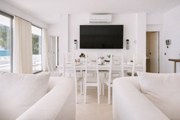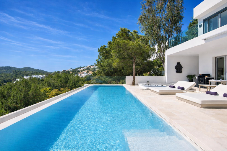 Este alquiler de villa de lujo vacacional en Ibiza con vistas al mar se encuentra en una posición elevada y dominante. Desde aquí, el horizonte se abre sin obstáculos. Además, las playas de Cala Olivera, Cala Llonga y Talamanca están a pocos minutos en coche. Restaurantes de alta gastronomía, beach clubs y el campo de golf de Ibiza se encuentran igualmente muy cerca.