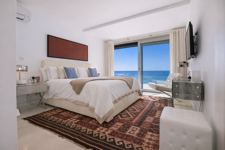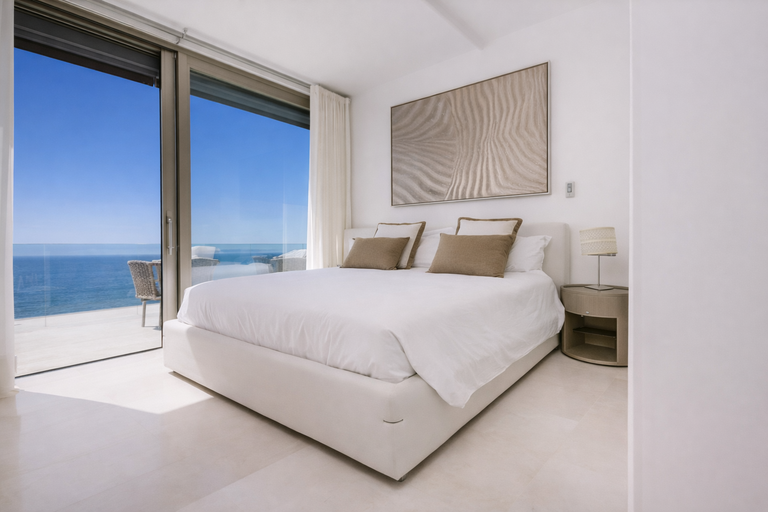 Los ventanales de suelo a techo permiten que la luz natural inunde los espacios, creando una conexión continua entre interior y exterior.  Desde el salón hasta los dormitorios, el mar se convierte en un elemento constante, presente en cada estancia.