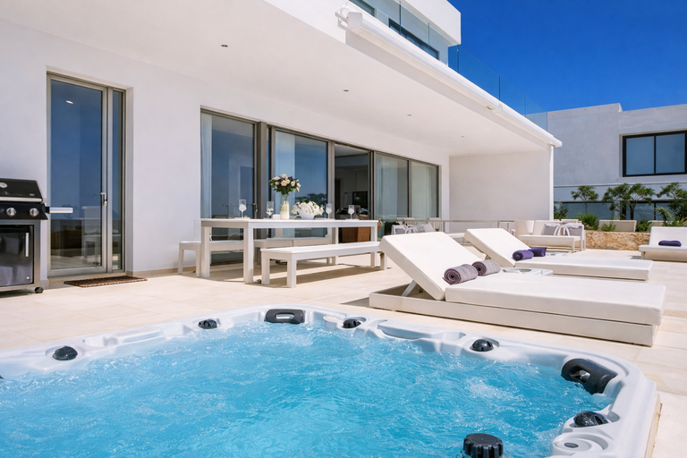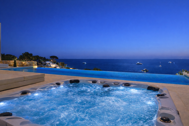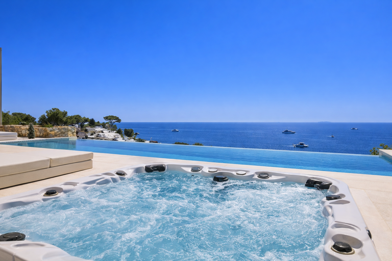 La piscina infinita orientada al Mediterráneo ofrece un efecto espectacular al atardecer, mientras que la zona de hidromasaje exterior invita a disfrutar de momentos de relajación absoluta con el mar como telón de fondo.