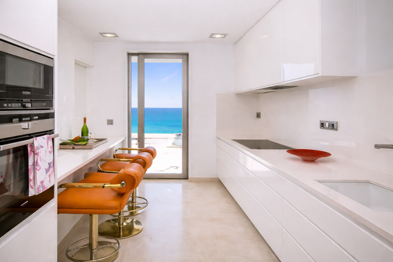 Cocina totalmente equipada con barra de desayuno. Electrodomésticos principales: Nevera, congelador, microondas, fogón, tostadora, horno, nespresso.