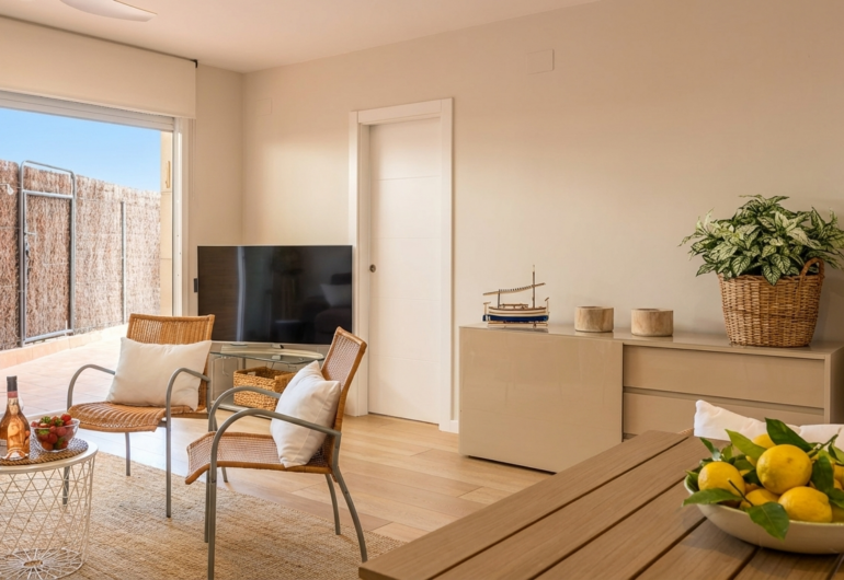 La propiedad dispone de dos acogedores y tranquilos dormitorios dobles, además de un baño moderno con una amplia ducha. La cocina, totalmente equipada con electrodomésticos de última generación, se adapta tanto a estancias cortas como medias. El salón-comedor de estilo abierto conecta directamente con la terraza, un espacio ideal para desayunos al sol o cenas al aire libre.