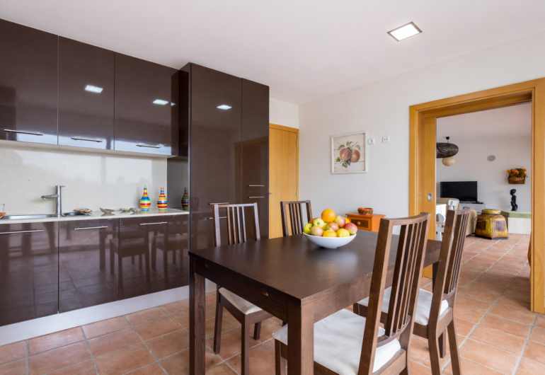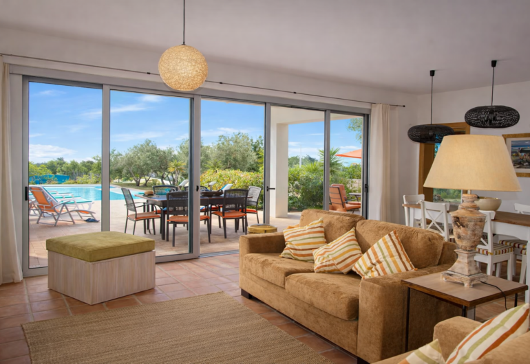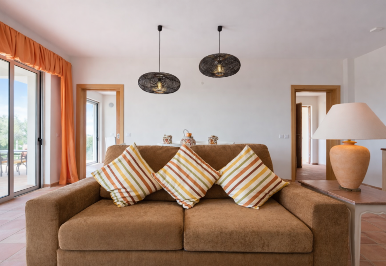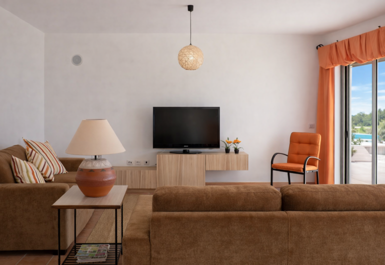 En el interior, la villa ofrece ambientes amplios y confortables, decorados con materiales de calidad y acabados cuidados. El mobiliario moderno, los tonos cálidos y la distribución equilibrada crean espacios pensados para el descanso y la convivencia. Todo el equipamiento ha sido seleccionado para garantizar una estancia cómoda y exclusiva, ideal tanto para familias como para estancias con amigos.