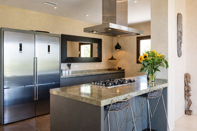 Cocina americana totalmente equipada. Electrodomésticos principales: frigorífico, congelador, microondas, horno, cocina de fuego, tostadora y lavavajillas.