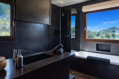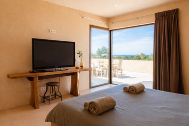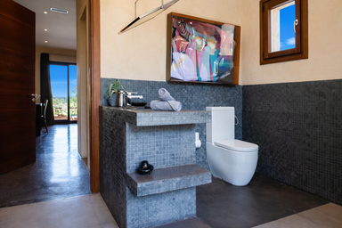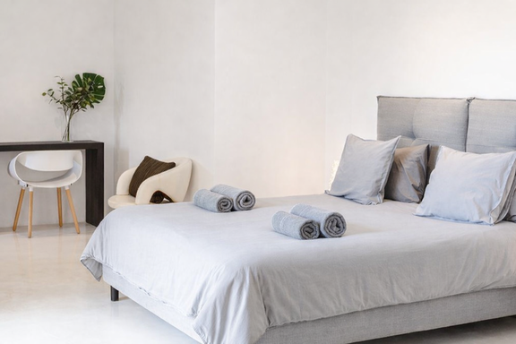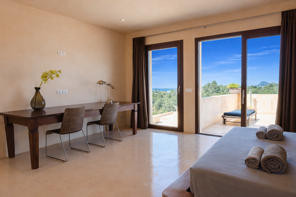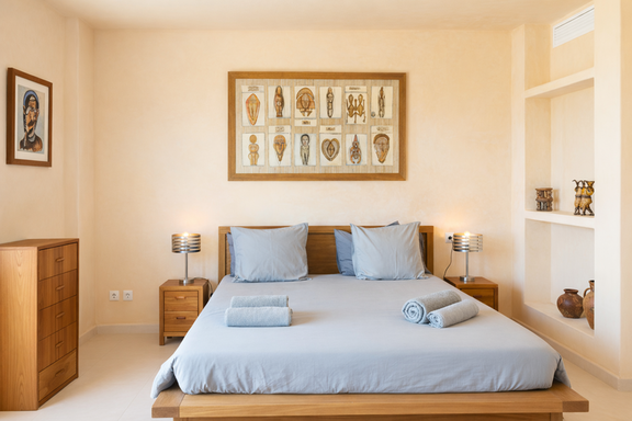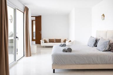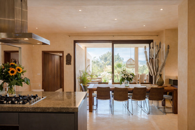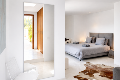 Los espacios interiores de Edén Mediterráneo destacan por su arquitectura moderna y funcional, bañada por la luz natural y abierta al paisaje. Con 6 habitaciones elegantes y 7 baños completos, esta villa privada para vacaciones en Ibiza ofrece una atmósfera cálida y exclusiva.