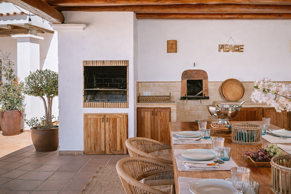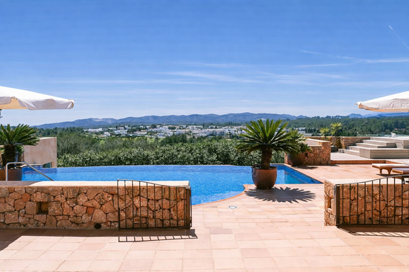 En el exterior, la piscina infinita climatizada se integra con el paisaje mediterráneo, acompañada de amplias terrazas, zona lounge, jacuzzi exterior y comedor al aire libre con capacidad para 18 personas. La cocina de verano y la barbacoa permiten disfrutar del auténtico estilo de vida ibicenco en un entorno íntimo y exclusivo.