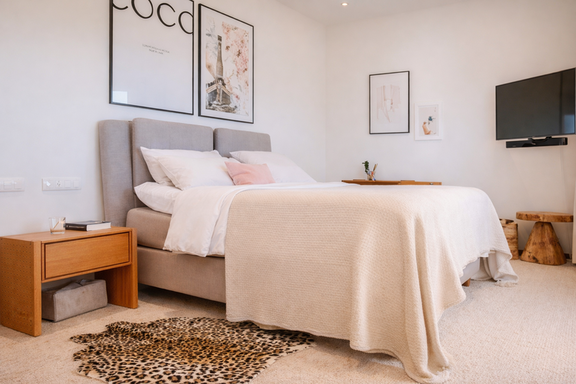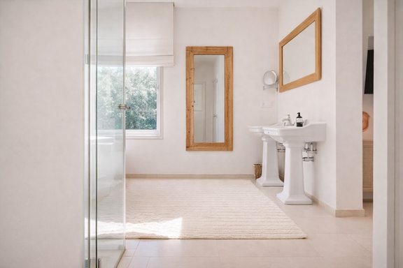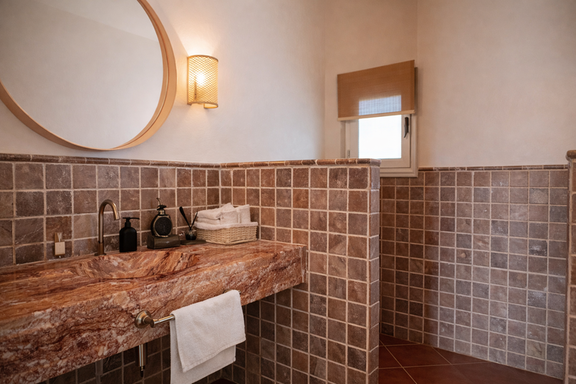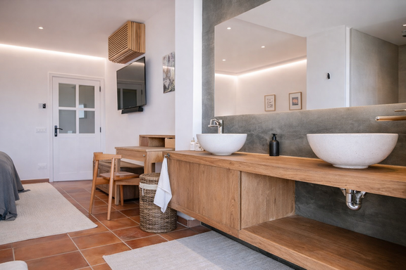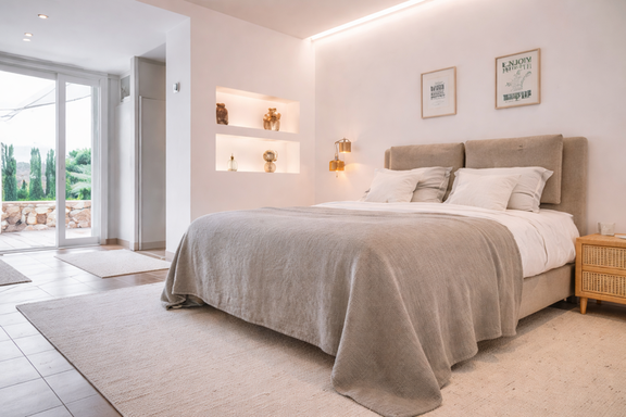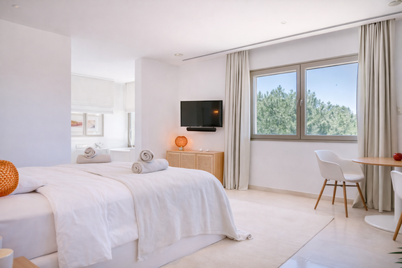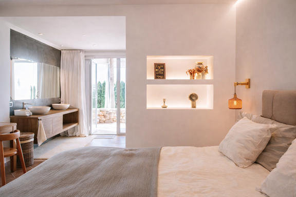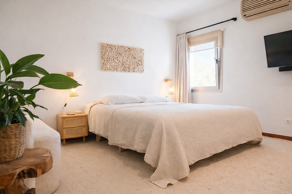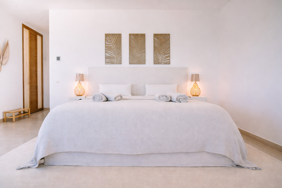 El interior de esta villa exclusiva en Ibiza ha sido diseñado para ofrecer una experiencia de confort superior. Dispone de seis dormitorios con baño en suite, incluyendo una elegante suite principal con vestidor, terraza privada y bañera jacuzzi, además de un dormitorio independiente en anexo que aporta un nivel adicional de privacidad.