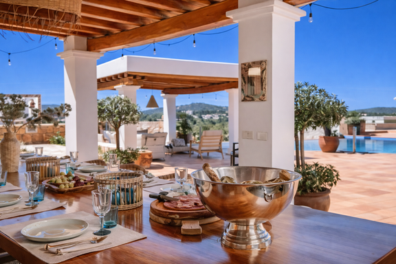 Los exteriores son uno de los grandes protagonistas de esta propiedad exclusiva en Santa Gertrudis. La piscina infinita climatizada se funde con el paisaje natural, rodeada de amplias terrazas, zona lounge y jacuzzi exterior. El comedor al aire libre con capacidad para 18 huéspedes, la cocina de verano y la barbacoa crean el escenario perfecto para reuniones privadas y celebraciones bajo el cielo ibicenco.