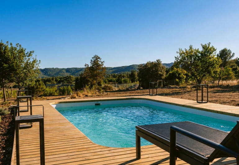 15.000 metros cuadrados de terreno con un bosque de pinos, antiguas tierras de cultivo y árboles frutales. La piscina está rodeada de tumbonas y sombrillas en un lado hay una zona de comedor y chill out. Un exuberante césped se extiende hasta los huertos y una antigua rueda de agua es un recordatorio de las raíces ancestrales de la tierra.