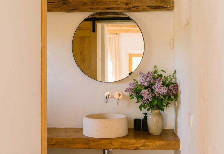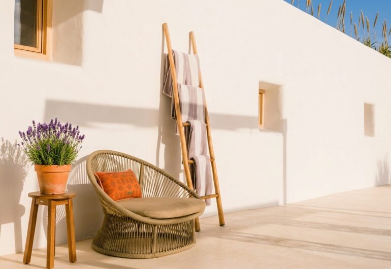 Villa Ibiza Es Pujolet destaca por su diseño inspirado en la arquitectura tradicional ibicenca, combinado con un enfoque contemporáneo que prioriza el confort y la armonía con el entorno natural. Esta villa ha sido concebida para ofrecer una experiencia de descanso total en uno de los rincones más auténticos de la isla.