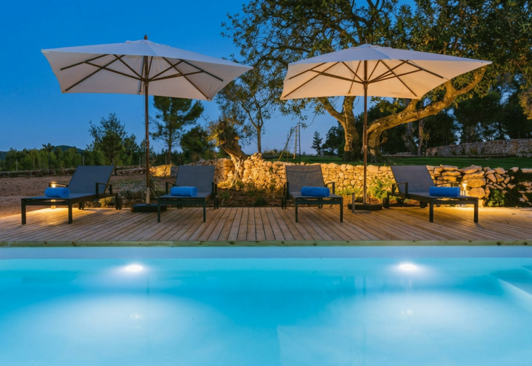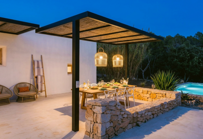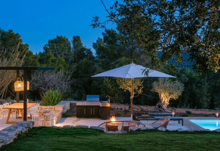 El exterior de Villa Es Pujolet es un verdadero paraíso. Su piscina de 7×2 metros invita al relax absoluto, mientras que la zona de barbacoa y las múltiples áreas de descanso permiten disfrutar de veladas inolvidables con vistas despejadas al valle. La propiedad es autosuficiente, con un sistema de energía solar y agua de pozo, reafirmando su compromiso con la sostenibilidad sin comprometer el lujo.