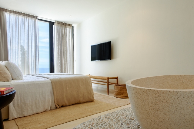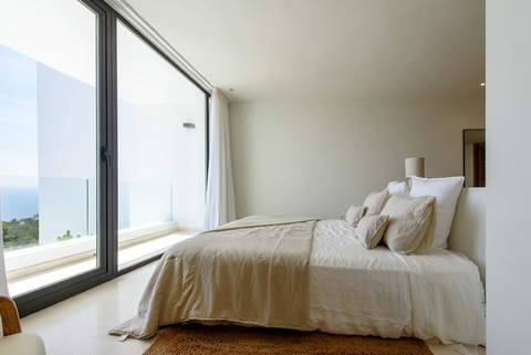 El diseño de esta villa de lujo en Ibiza con vistas al mar destaca por su arquitectura moderna, elegante y funcional. Grandes ventanales de suelo a techo permiten que la luz natural fluya por todas las estancias, creando una conexión continua entre interior y exterior y potenciando las vistas al Mediterráneo.