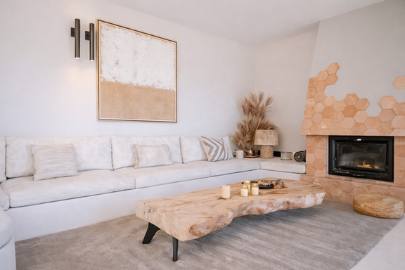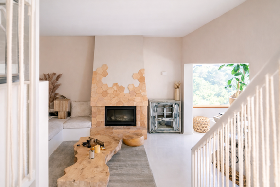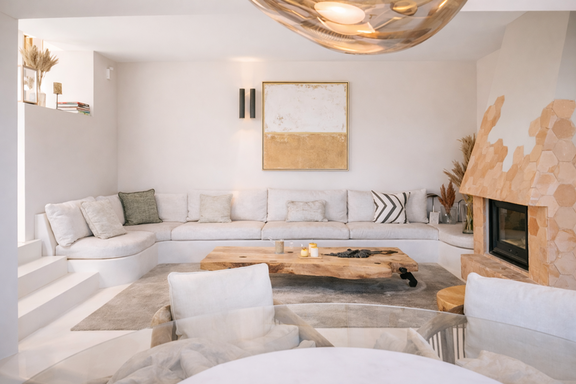 Esta villa vacacional de lujo en Ibiza con vistas al campo destaca por su diseño contemporáneo, donde materiales naturales como piedra y madera crean una atmósfera elegante y acogedora.