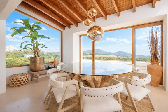 Los grandes ventanales permiten que la luz natural fluya durante todo el día, integrando interior y exterior en perfecta armonía.