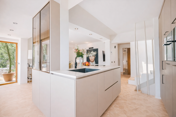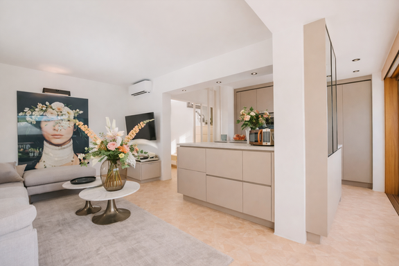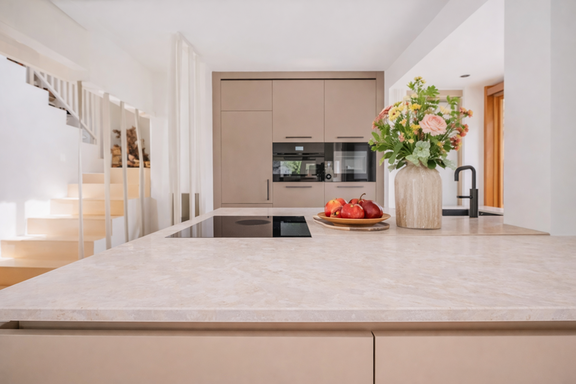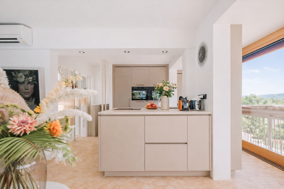 La cocina, completamente equipada y de diseño contemporáneo, permite disfrutar tanto de momentos informales como de veladas gastronómicas más elaboradas.