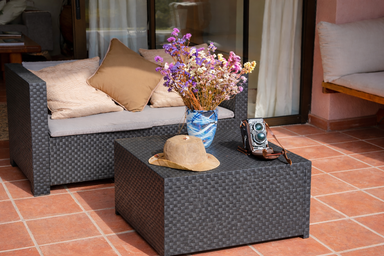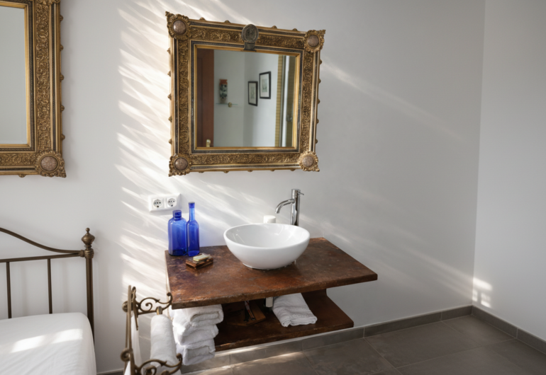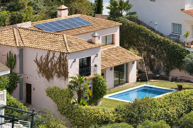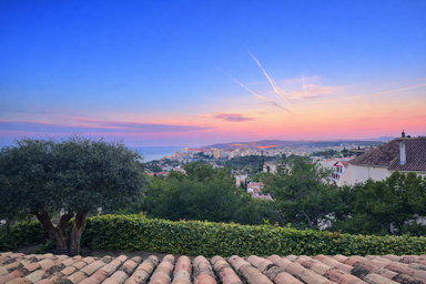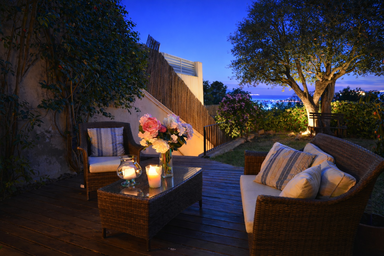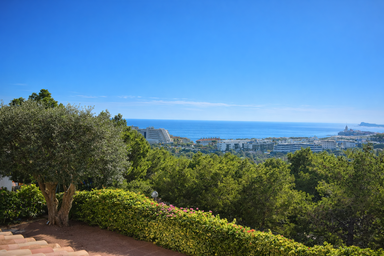 En el exterior, la villa despliega un precioso jardín lleno de color, con un majestuoso olivo que da sombra natural y una piscina privada rodeada de seis tumbonas. Un porche chill-out completa el escenario, ideal para largas sobremesas, veladas al aire libre o momentos de desconexión absoluta. Gracias a su orientación, el sol ilumina los exteriores durante todo el día y regala mágicos atardeceres frente al Mediterráneo.